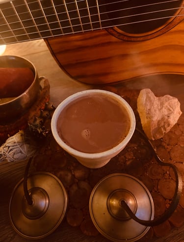 Meine Singkreise kombiniere ich gerne mit einer Kakaozeremonie. Ich verwende hochwertigen Bio-Rohkakao von Kakaochi, einem österreichischen Unternehmen, dass den Kakao unter sehr fairen Bedingungen aus Guatemala importiert. Kakao gilt in den Herkunftsländern als weibliche Heilpflanze. Neben zahlreichen wichtigen Nährstoffen, Mineralien und Vitaminen, hat diese Pflanze auch eine Wirkung auf unsere Herzen. Ich sage gern: Mama Kakao schenkt uns eine Möglichkeit, ganz sanft zu uns selbst, in unser Herz hinein zu hören; die Liebe zu uns selbst und zum Leben auf neue Weise zu entdecken. Der Kakao wird rein pflanzlich während der Zeremonie zubereitet, ausgeschenkt und gemeinsam getrunken. Die Zeremonie hat meist ein Rahmen-Thema (z.B. Selbstliebe, Mut sich zu zeigen, Verbundenheit, Achtsamkeit, Schattenanteile usw.), auf dieses Thema darfst du dich in der für dich stimmigen Intensität einlassen; im gemeinsamen Austausch, in einer angeleiteten Meditation oder einer Sound-Journey - das variiert von Abend zu Abend.